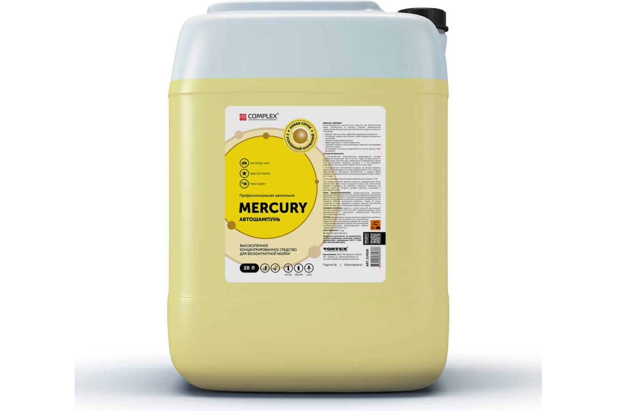 Автошампунь концентрированный бесконтактный Mercury 20 кг Complex для бесконтактной мойки автомобилей в условиях сильной загрязненности поверхностей автотранспорта, высокой жесткости воды, пониженных температур. Образует обильную пену, эффективно удаляющую загрязнения. Не образует осадка в магистралях и трубопроводах автомоечных комплексов. Работает в воде любой жесткости. Эффективно удаляет стойкие загрязнения. Позволяет получить чистую блестящую поверхность без разводов и белесого налета. Не оказывает негативного воздействия на пластик, резину и ЛКП автомобиля. Применение: Пеногенератор: 1:70 – 1:170 (400-700мл на 50л). Пенокомплект: 1:8 – 1:12 (80-120мл на 1л). Дозатрон 1 – 2%. Время выдержки 2-3 мин.