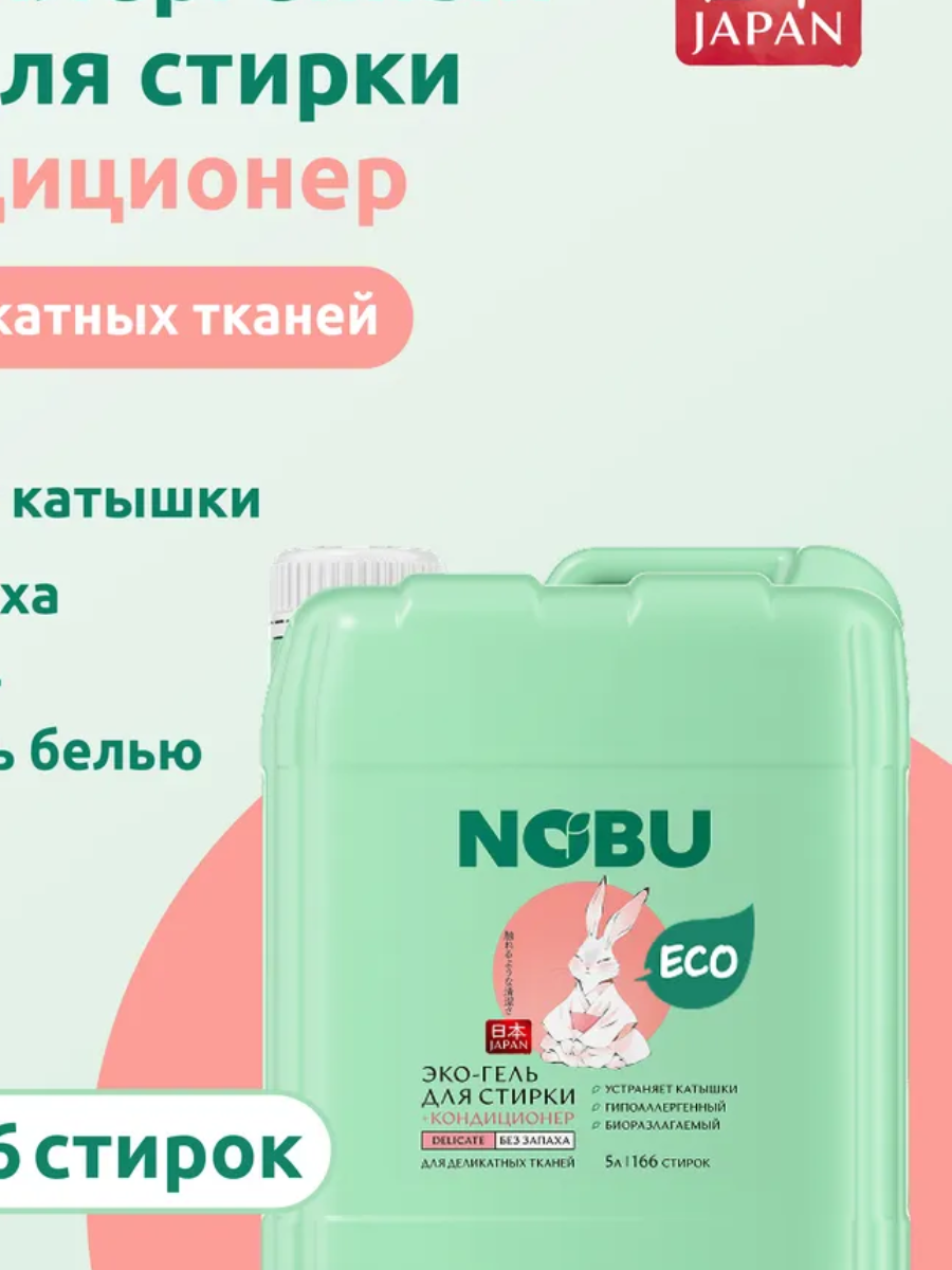 Эко-гель для стирки NOBU с кондиционером на 97% состоит из натуральных ингредиентов, глубоко очищает волокна, сохраняет насыщенность цвета и делает ткани мягкими. • С первых дней жизни • Биоразлагаемый • Безопасно для септиков • Защищает яркость цвета • Устраняет катышки • Придает мягкость вещам • Сохраняет структуру волокон 0% фосфатов, фосфонатов, синтетических красителей и отдушек, SLS, ЭДТА, хлора. NANOGREEN – Японская нанотехнология для эффективного очищения и поддержания здоровой чистоты.