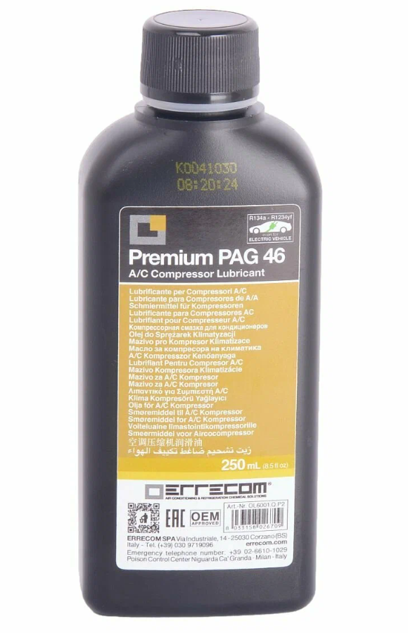 Смазочный материал для систем кондиционирования автомобилей с компрессором, работающим на хладагенте типа R134a.Специальное масло для сервисного обслуживания автомобильных кондиционеров и холодильных машин. Имеет низкую температуру застывания и хорошую антиокислительную стабильность. Индекс вязкости 46 мм Температура замерзания -45 °C Функциональные особенности масла PAG 46 Errecom Применяется совместно с маслорастворимыми хладагентами, например, R134A. Предназначено для смазывания компрессоров автокондиционеров и холодильных машин, отвода тепла и уплотнения. Выполняет требования ведущих производителей компрессорной техники и систем охлаждения. Масла поставляются только в жестяных баллонах объемом до 1 литра, что гарантирует 100% сохранность всех свойств масла до начала его применения В автомобилях европейских, корейских и японских марок, как правило, используются масла PAG-46 и PAG-100, в американских автомобилях залито масло PAG-150, PAG-100 и PAG-46.