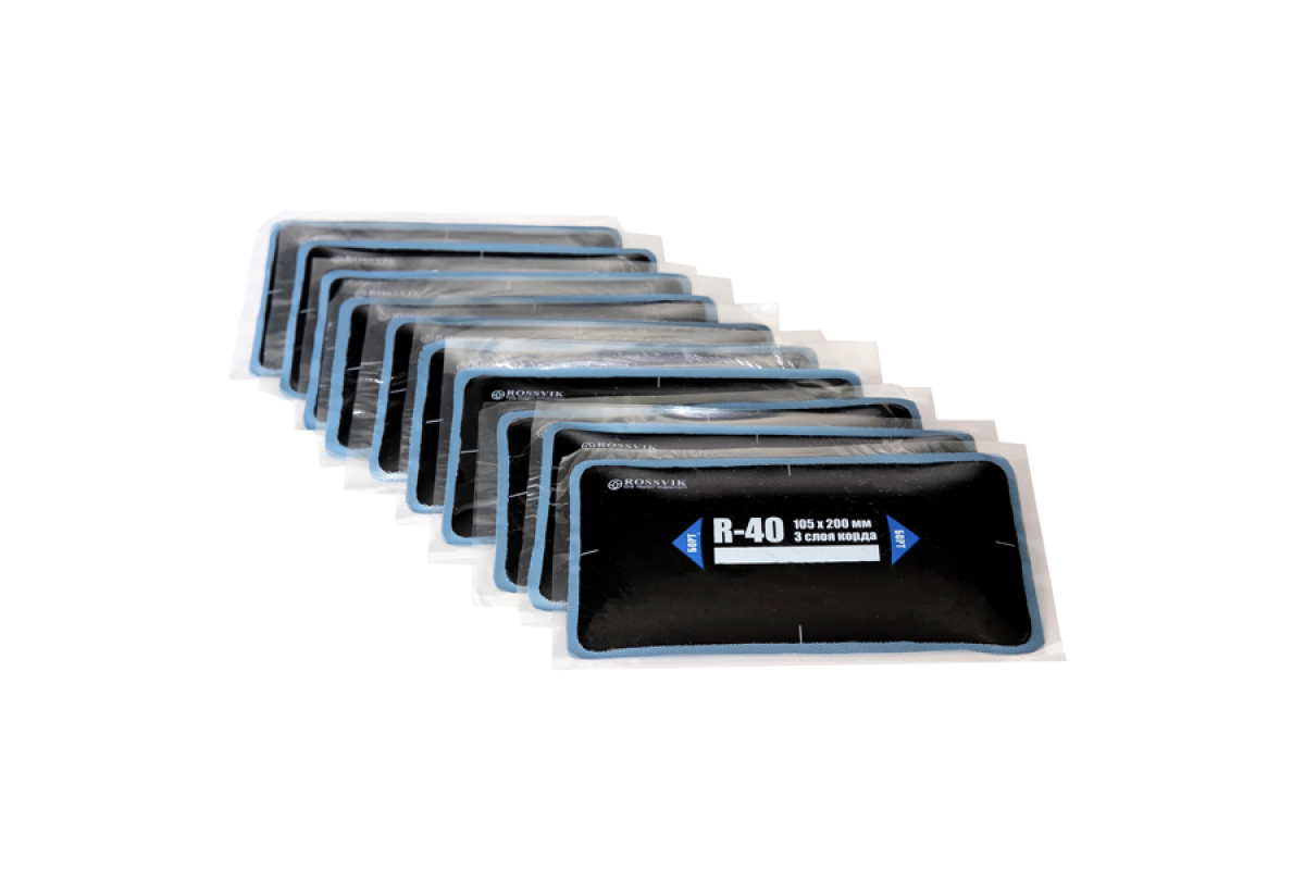 Пластырь, заплатка шиноремонтная R-40 (ROSSVIK) 105х200мм/3 слоя корда. Пластыри  R-40 (холодные) 105х200/3 сл., 1 шт. Размер 105х200 мм. 3 слоя корда. Радиальные пластыри ROSSVIK предназначены для ремонта всех типов радиальных бескамерных и камерных шин легковых автомобилей, грузового и пассажирского транспорта, сельскохозяйственной, карьерной и землеройной техники. Они обеспечивают надежный и долговечный ремонт в любой ремонтопригодной зоне шины.