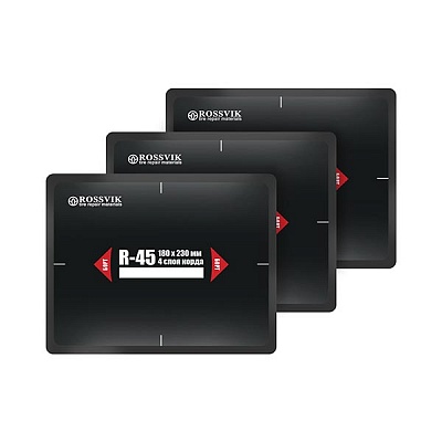Пластырь, заплатка шиноремонтная R-45 термо (ROSSVIK) 180х230мм/4 слоя корда. Термопластыри с текстильным кордом для ремонта радиальных шин ("горячая" вулканизация). Термопластыри ROSSVIK применяются в условиях повышенных нагрузок при эксплуатации шины Специальный химический слой после прогрева приобретает особую прочность. Температура прогрева 140-150 °С под давлением не менее 3 Атм. Для установки термопластырей применяют специальный термоклей.
