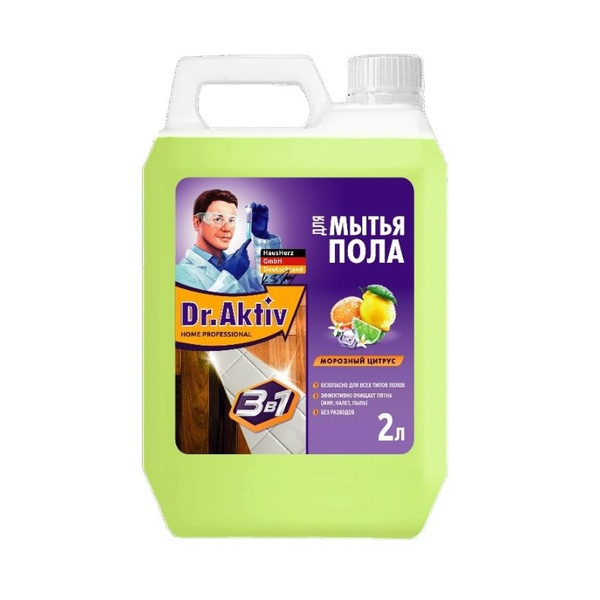 Средство для мытья пола Dr.Aktiv (Др. Актив) Морозный цитрус для всех типов полов с эффективной формулой 3 в 1 обеспечивает: - эффективное удаление любых пятен. - без разводов! - безопасно для всех типов полов Dr. Aktiv: быстро. Чисто. Профессионально. Почему стоит отдать предпочтение инновационному бренду чистящих средств Dr. Aktiv? - Профессиональный клининг для вашего дома. - Немецкий стандарт качества. - Dr. Aktiv поможет быстро и эффективно справиться с уборкой. - Экономия усилий и времени!