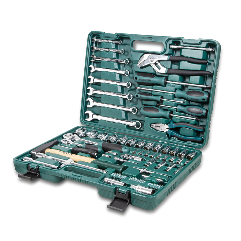 UST077 НАБОР УНИВЕРСАЛЬНЫЙ 77 предметов Состав набора: 1/2" • Головка 1/2" 6-ти гранная: 12, 13, 14, 15, 17, 18, 19, 21, 22, 24, 27, 30, 32мм • Головка свечная 1/2": 16, 21мм • Трещотка 1/2, 36 зубов • Удлинитель 1/2", 125мм • Удлинитель 1/2", 250мм • Кардан 1/2" • Переходник M1/2" – F3/8" 1/4" • Головка 1/4" 6-ти гранная: 4, 5, 6, 7, 8, 9, 10, 11, 12мм • Головка 1/4" 6-ти гранная глубокая: 8, 10, 12, 13мм • Трещотка 1/4", 36 зубов • Вороток Т-образный 1/4", 130мм • Удлинитель 1/4", 75мм • Удлинитель гибкий 1/4", 145мм • Кардан 1/4" • Отвертка-вороток 1/4" • Держатель бит 1/4" БИТЫ 1/4" • Бита 1/4" PHILIPS: PH1, PH2, PH3 • Бита 1/4" SLOTTED: SL3, SL4, SL5, SL6 • Бита 1/4" HEX: H3, H4, H5, H6 • Бита 1/4" STAR: Т10, Т15, Т20, Т25, Т27, Т30, T40 КЛЮЧИ ГАЕЧНЫЕ • Ключ гаечный комбинированный: 8, 10, 12, 13, 14, 15, 17, 19мм • Ключ шестигранный: 1.5, 2, 3мм • Пассатижи 180мм • Клещи переставные 250мм • Молоток 500г ОТВЕРТКИ • Отвертка крестовая: PH1*80мм, PH2*100мм, PH3*150мм • Отвертка шлицевая: SL4*80